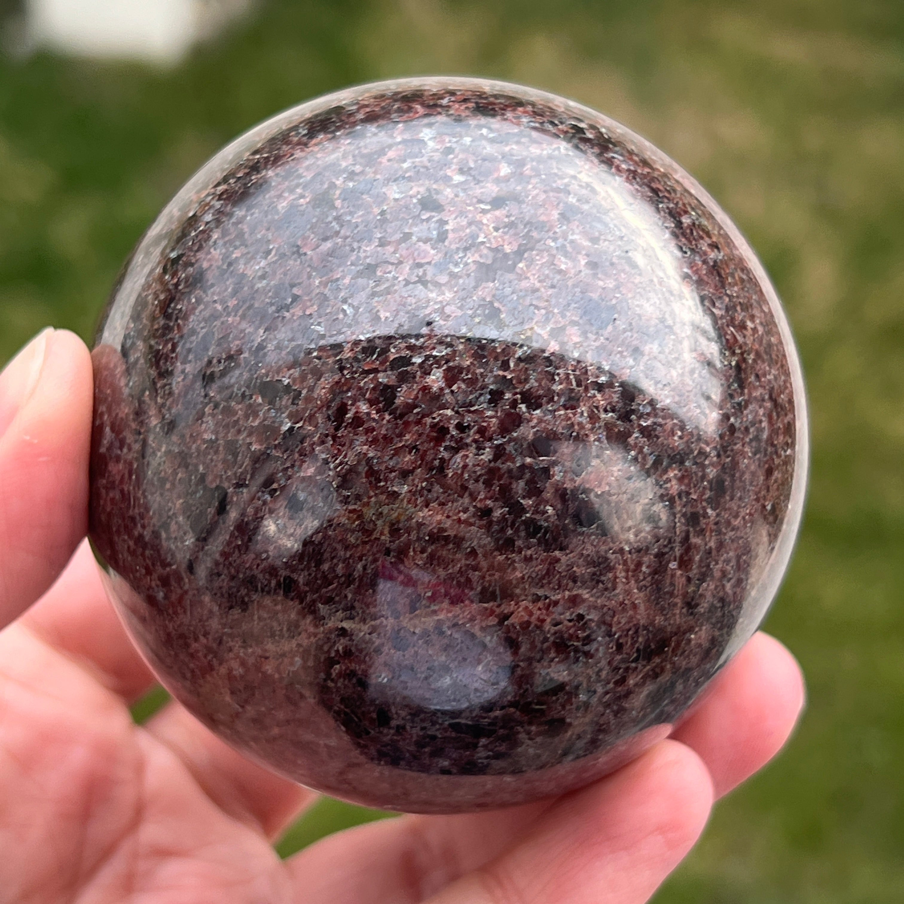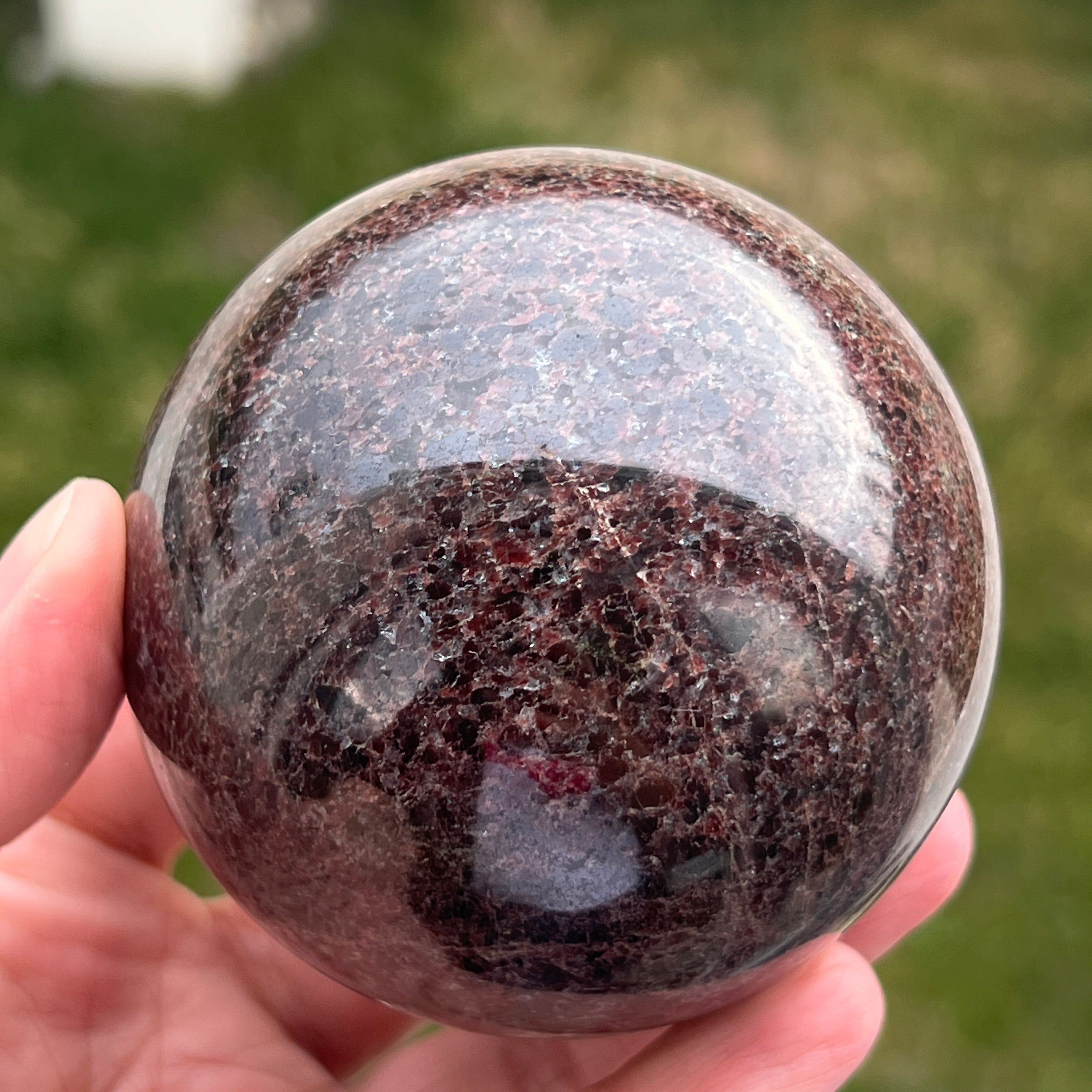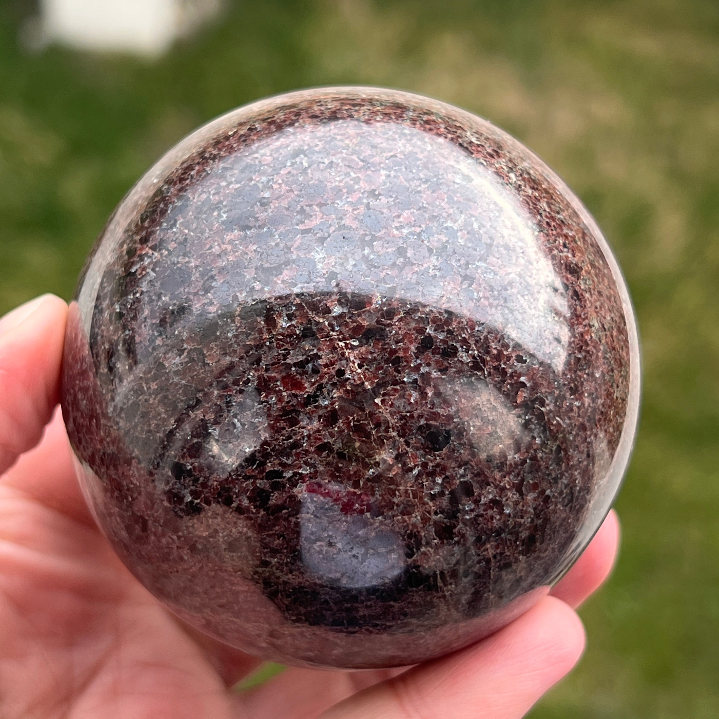 La esfera de granate está hecha de un mineral del grupo de los silicatos, conocido por su estructura cristalina compacta y por sus tonos intensos, desde el rojo oscuro hasta los tonos profundos de cereza. Debido a su composición, el granate es un material duro y estable, lo que lo hace adecuado para trabajarse en formas como la esfera, donde la textura y el color pueden observarse de manera uniforme desde todos los ángulos.