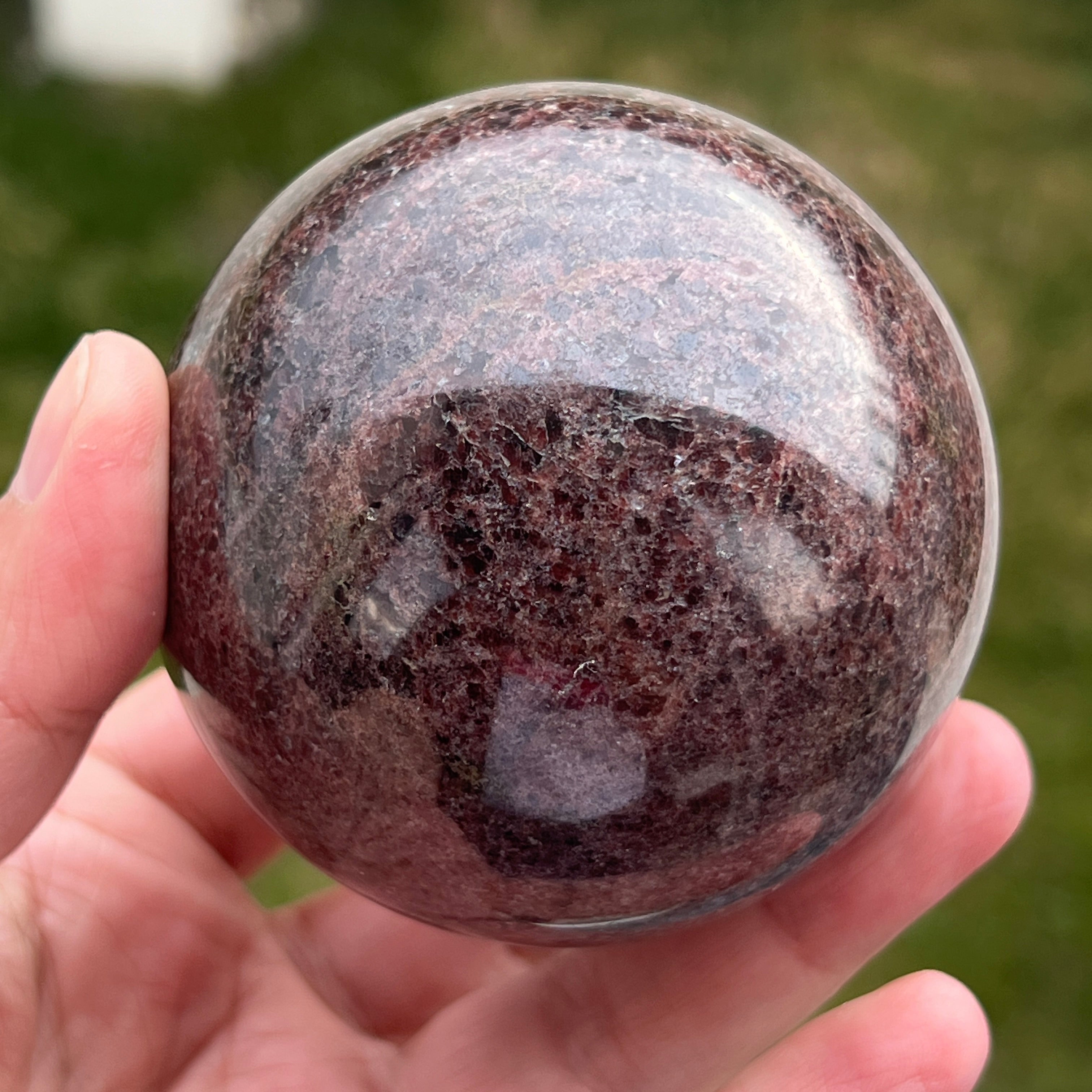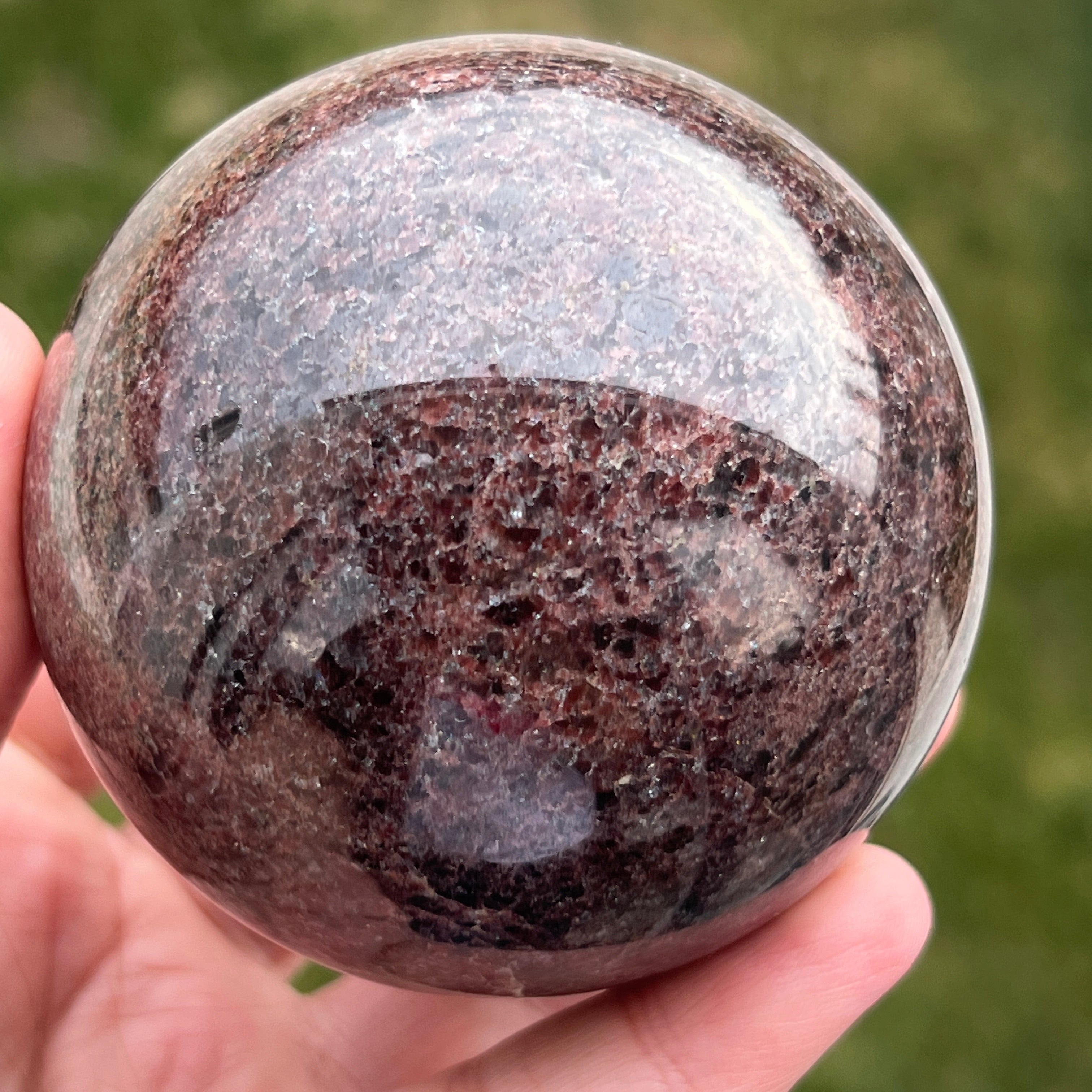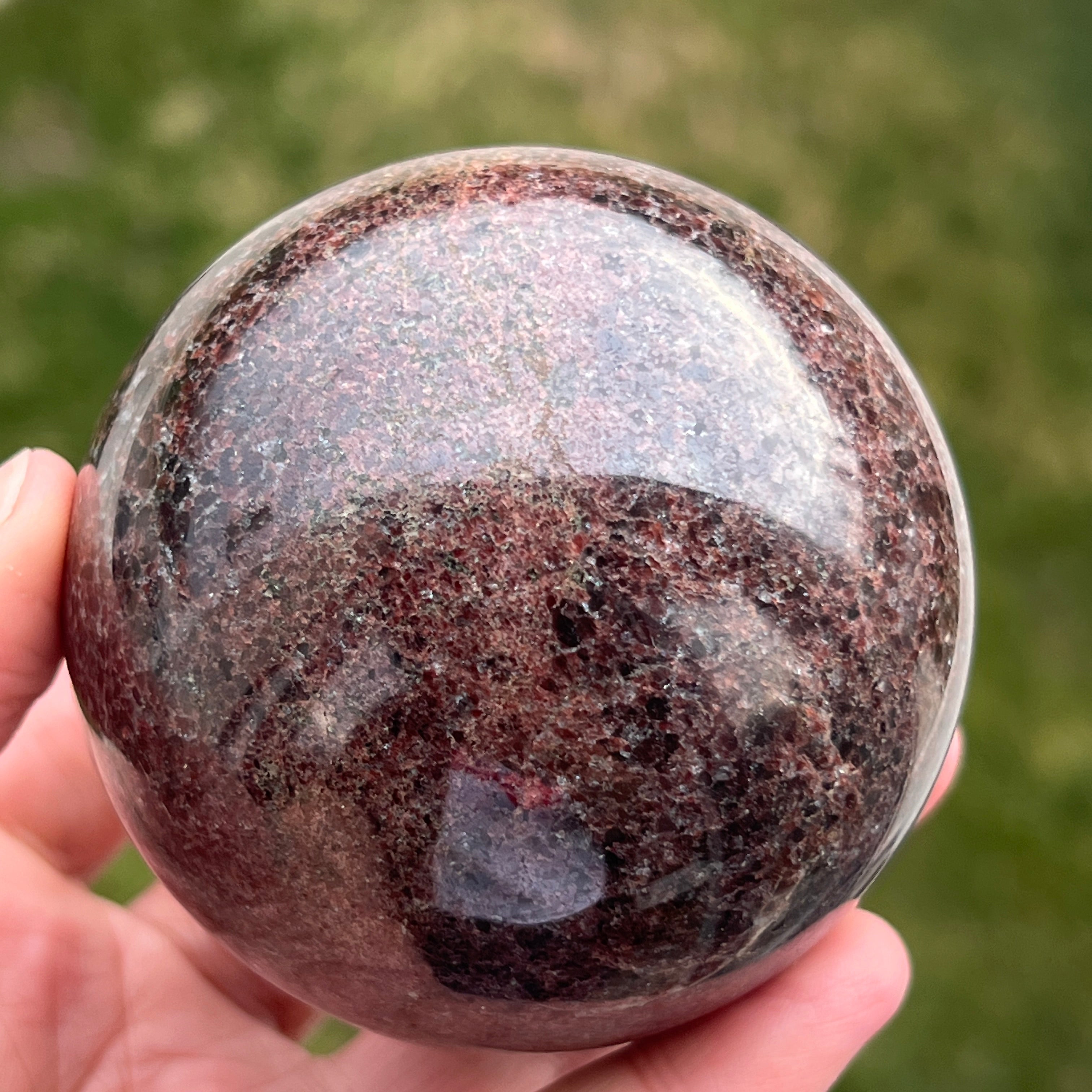 La esfera de granate está hecha de un mineral del grupo de los silicatos, conocido por su estructura cristalina compacta y por sus tonos intensos, desde el rojo oscuro hasta los tonos profundos de cereza. Debido a su composición, el granate es un material duro y estable, lo que lo hace adecuado para trabajarse en formas como la esfera, donde la textura y el color pueden observarse de manera uniforme desde todos los ángulos.