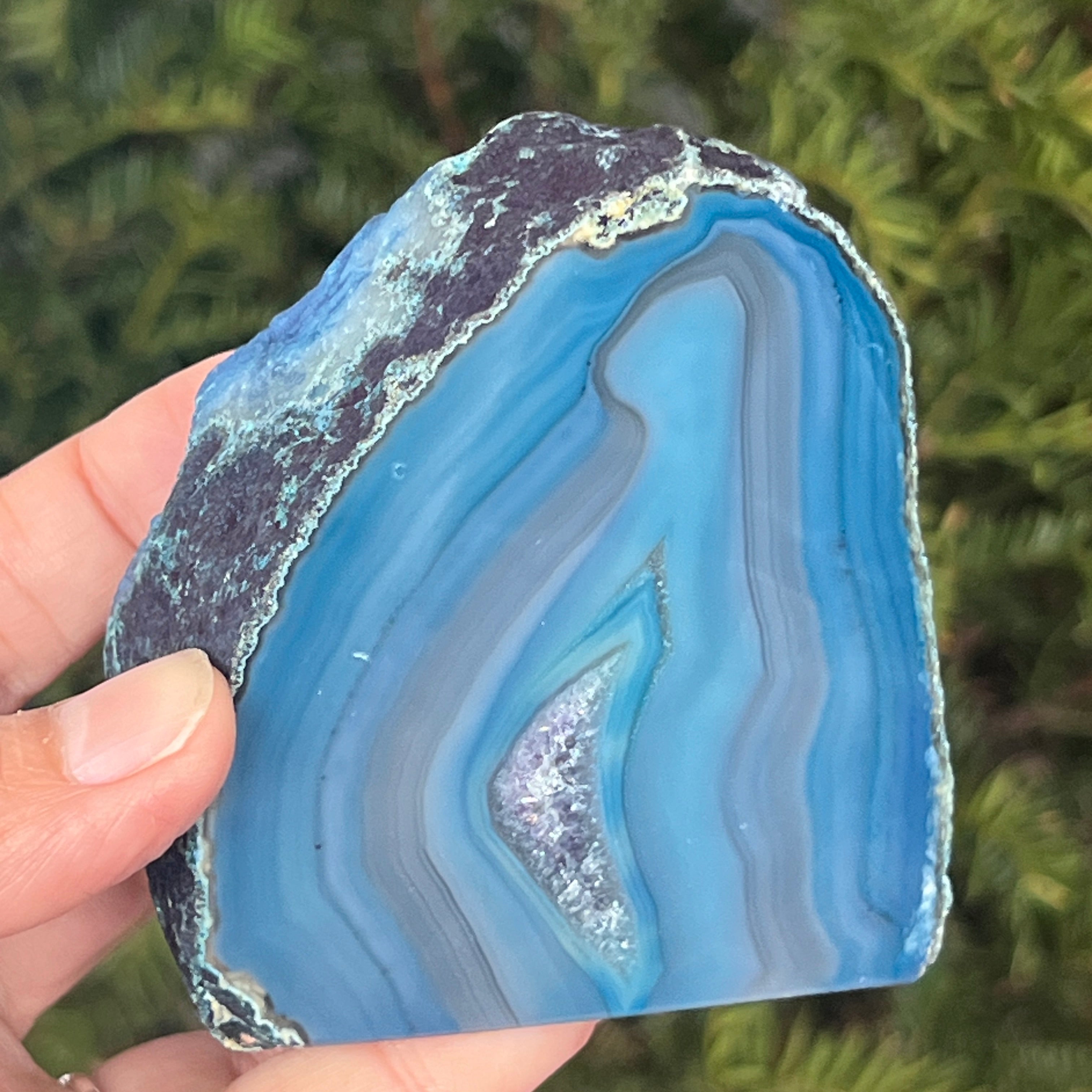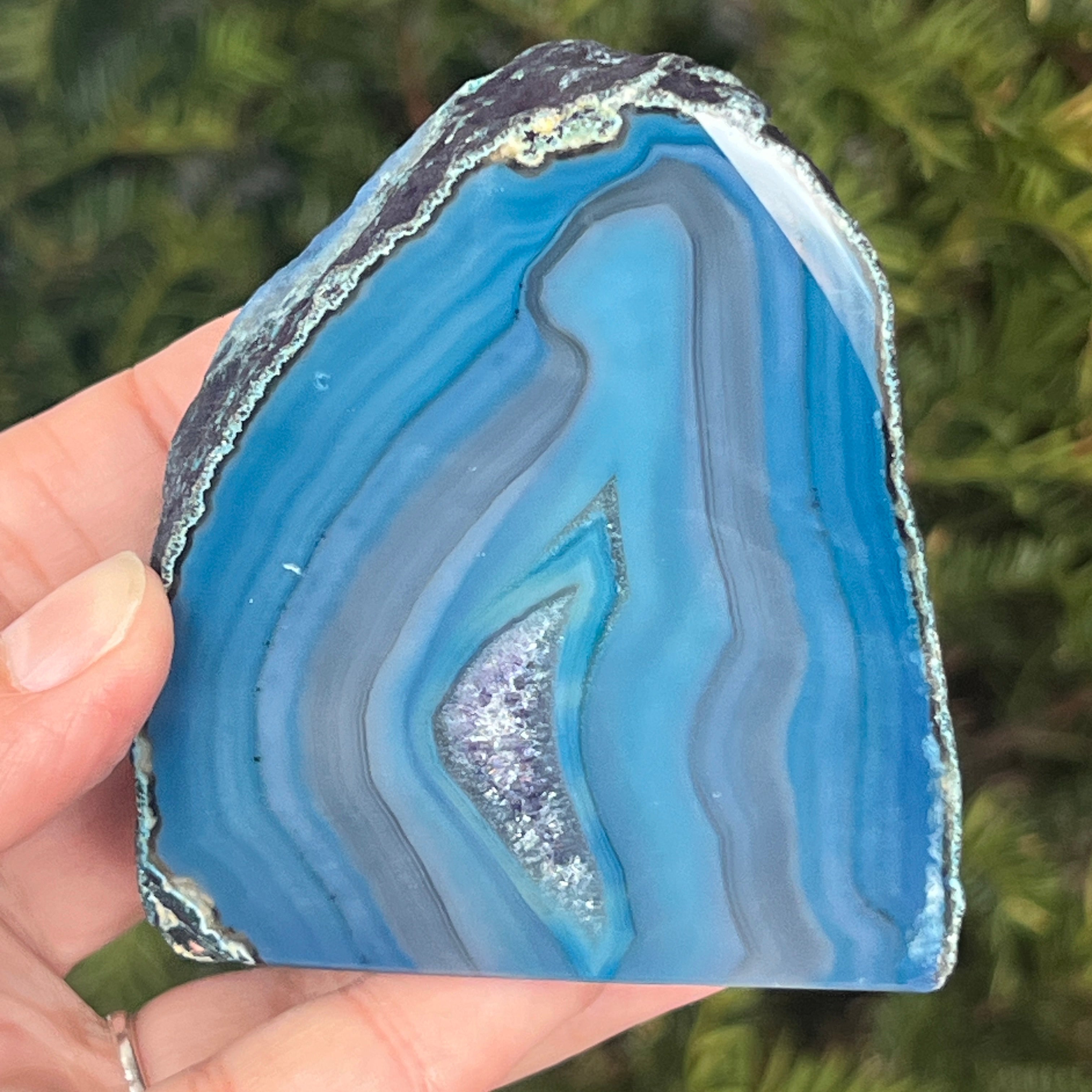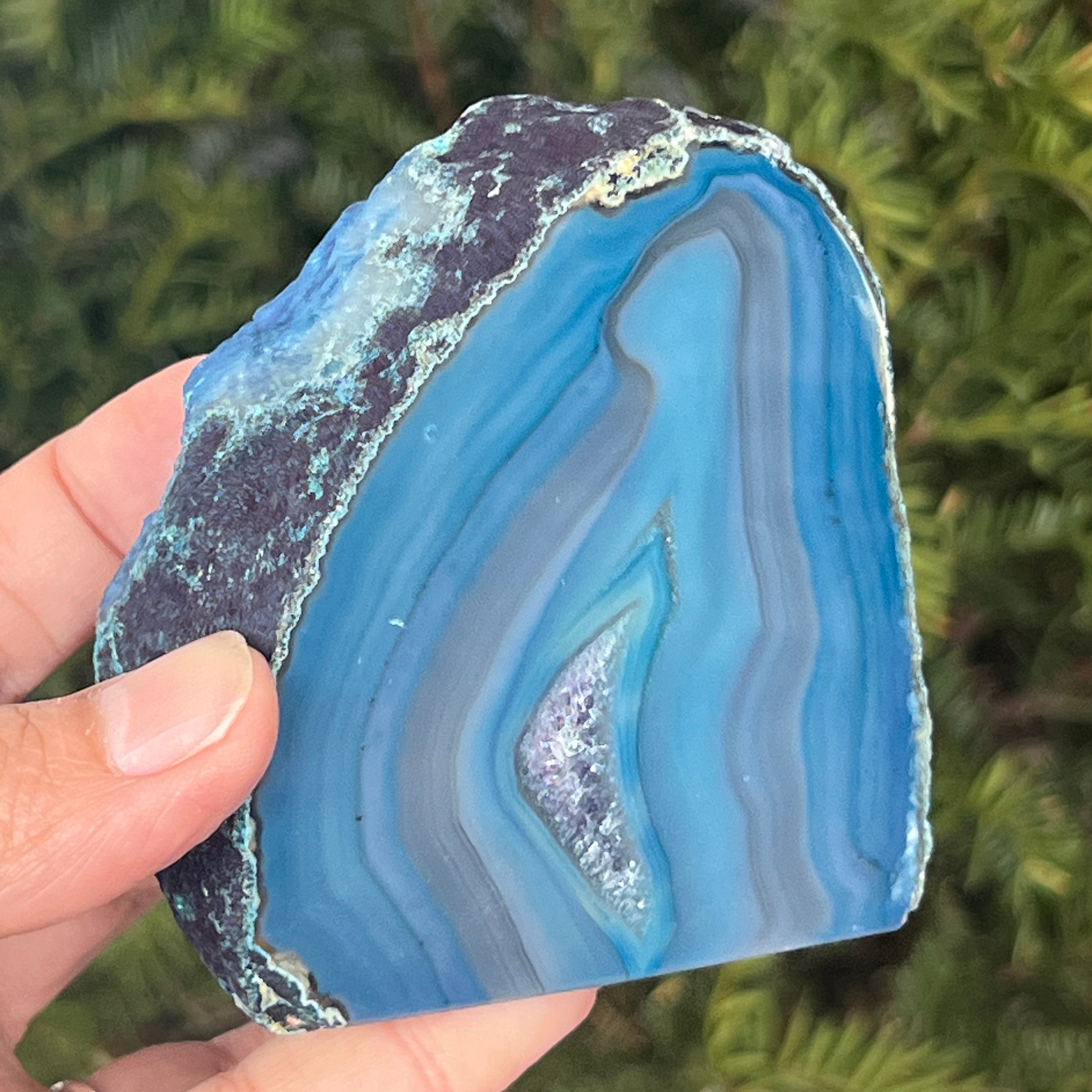 El ágata verde-azulada es una variedad de calcedonia con estructura estratificada, formada por depósitos sucesivos de sílice en cavidades geológicas. Sus tonos entre verde y azul resaltan las bandas naturales características del ágata. Es apreciada por la armonía de sus colores y por la simbología asociada con el equilibrio interior y la tranquilidad emocional.