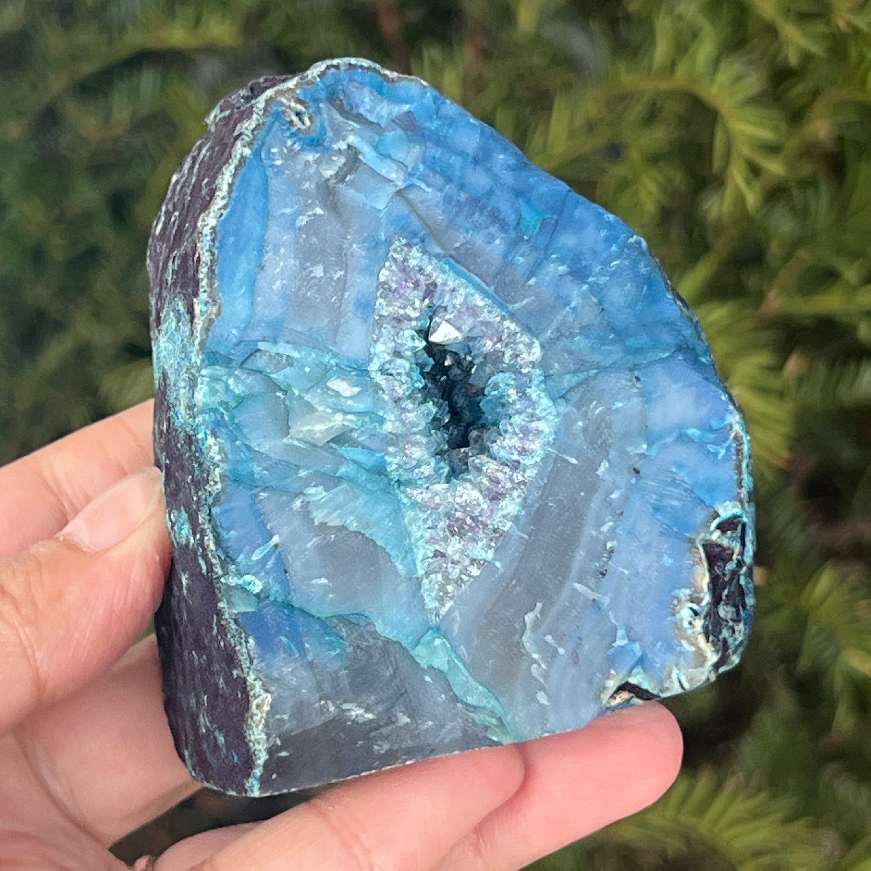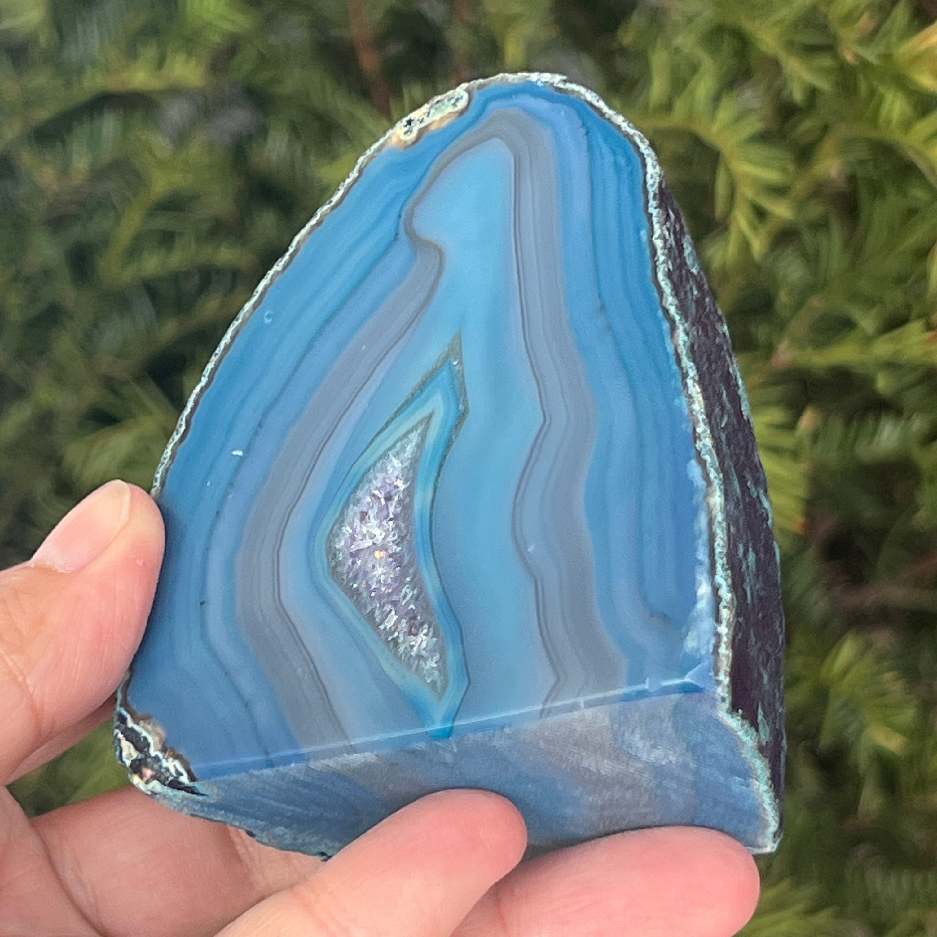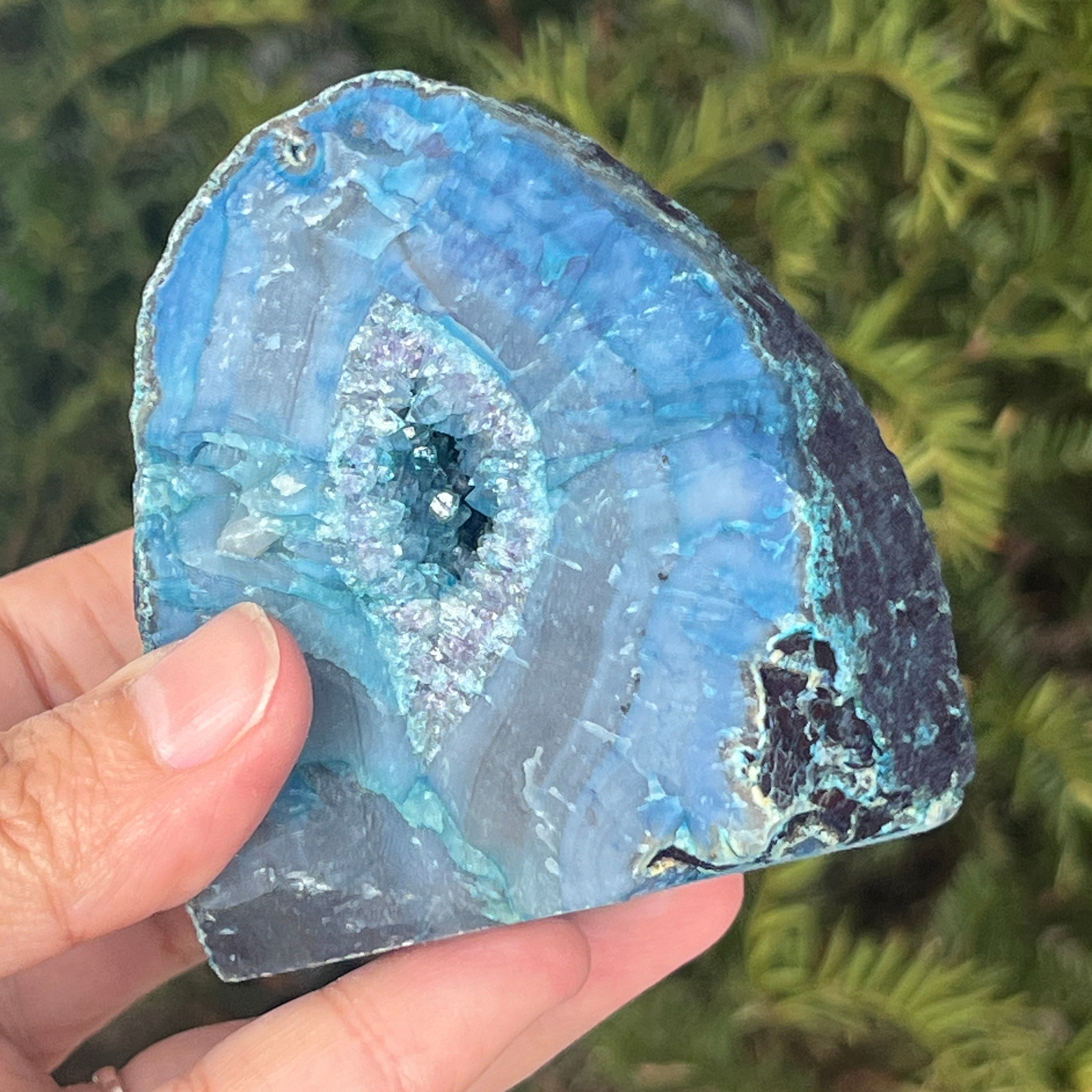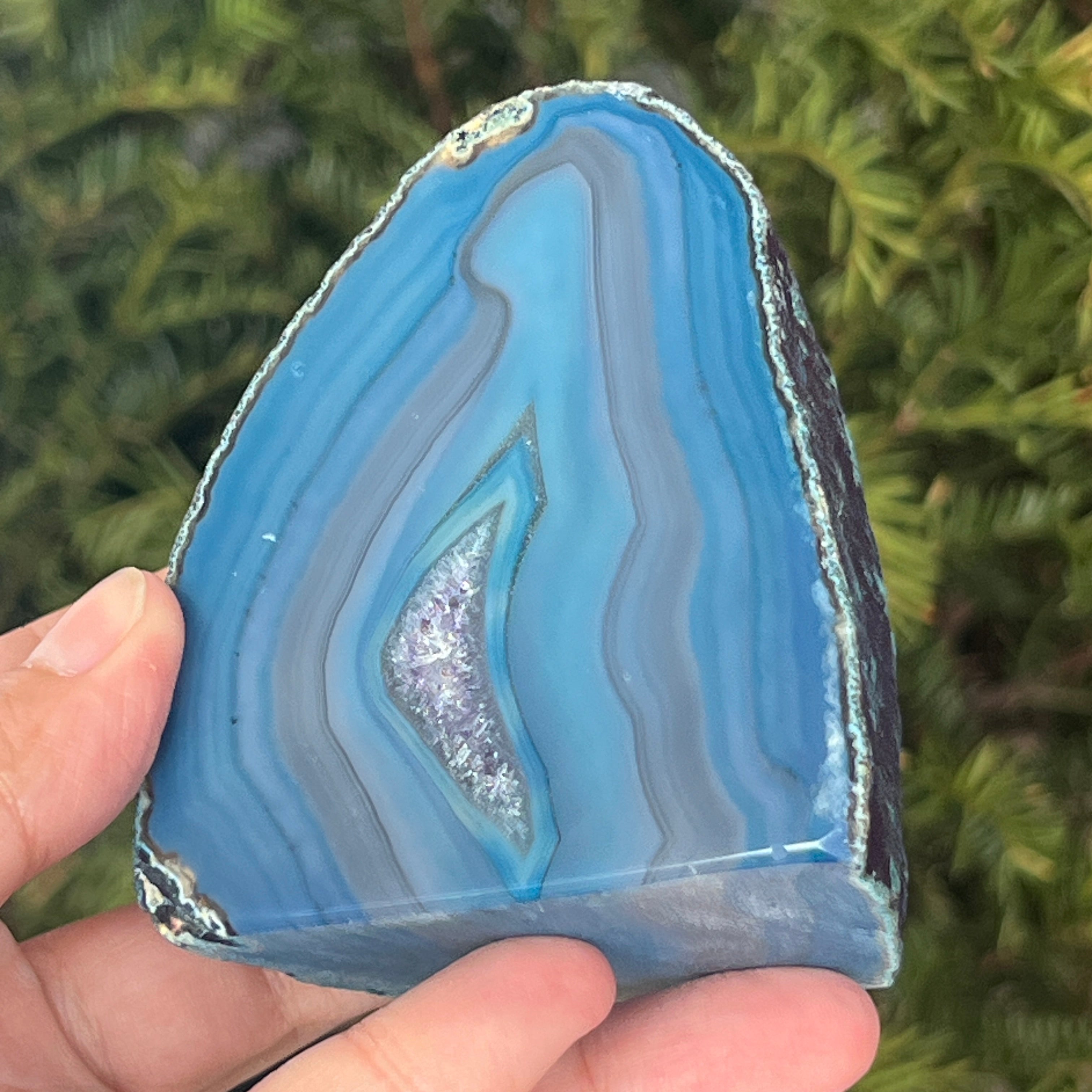 El ágata verde-azulada es una variedad de calcedonia con estructura estratificada, formada por depósitos sucesivos de sílice en cavidades geológicas. Sus tonos entre verde y azul resaltan las bandas naturales características del ágata. Es apreciada por la armonía de sus colores y por la simbología asociada con el equilibrio interior y la tranquilidad emocional.