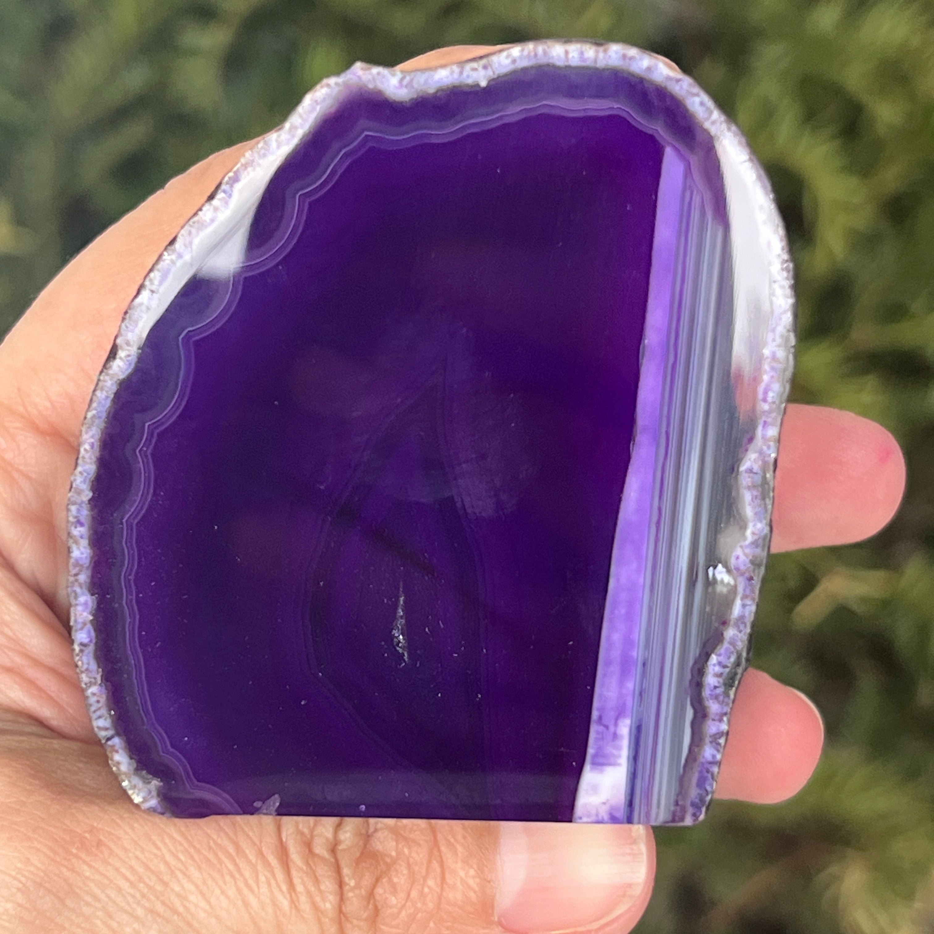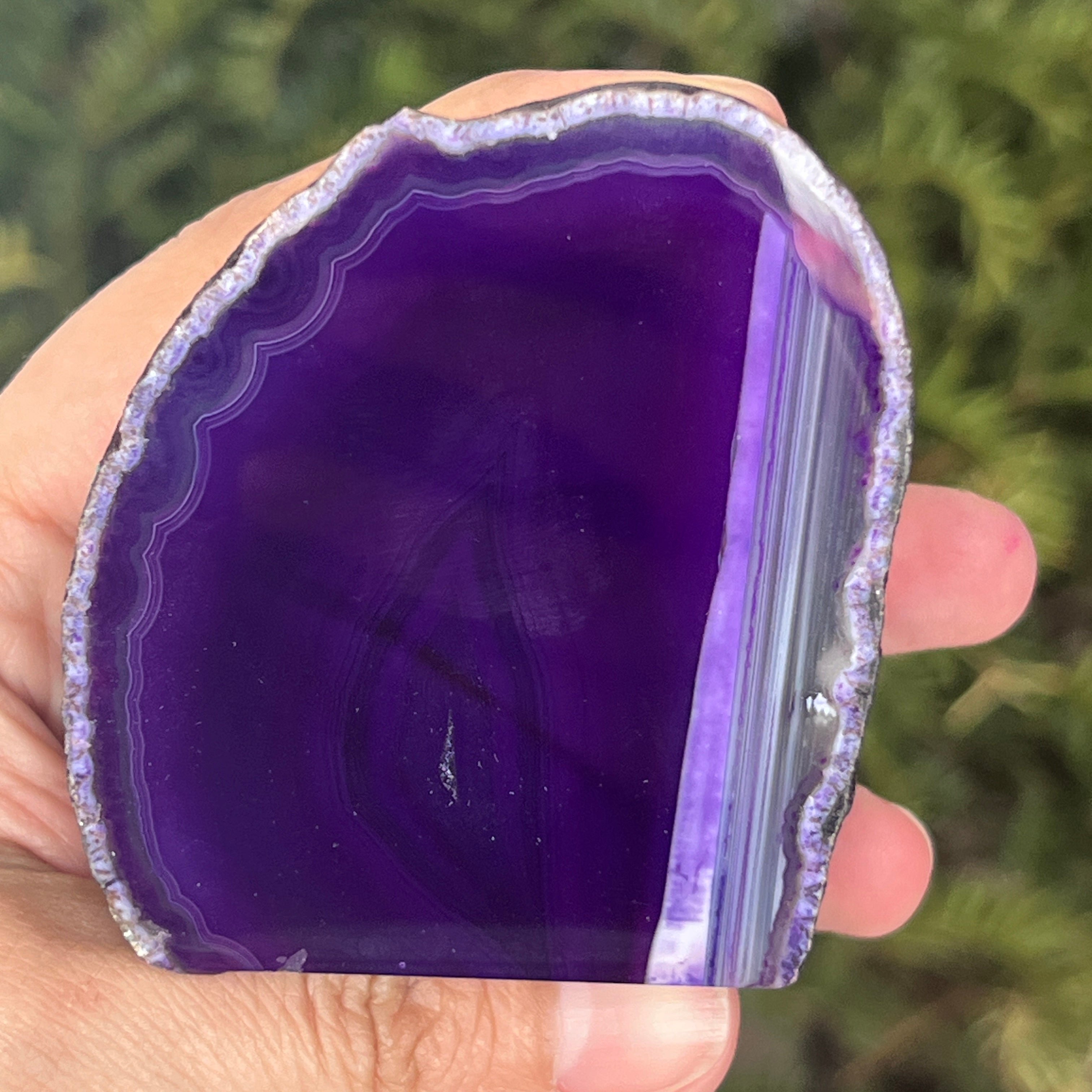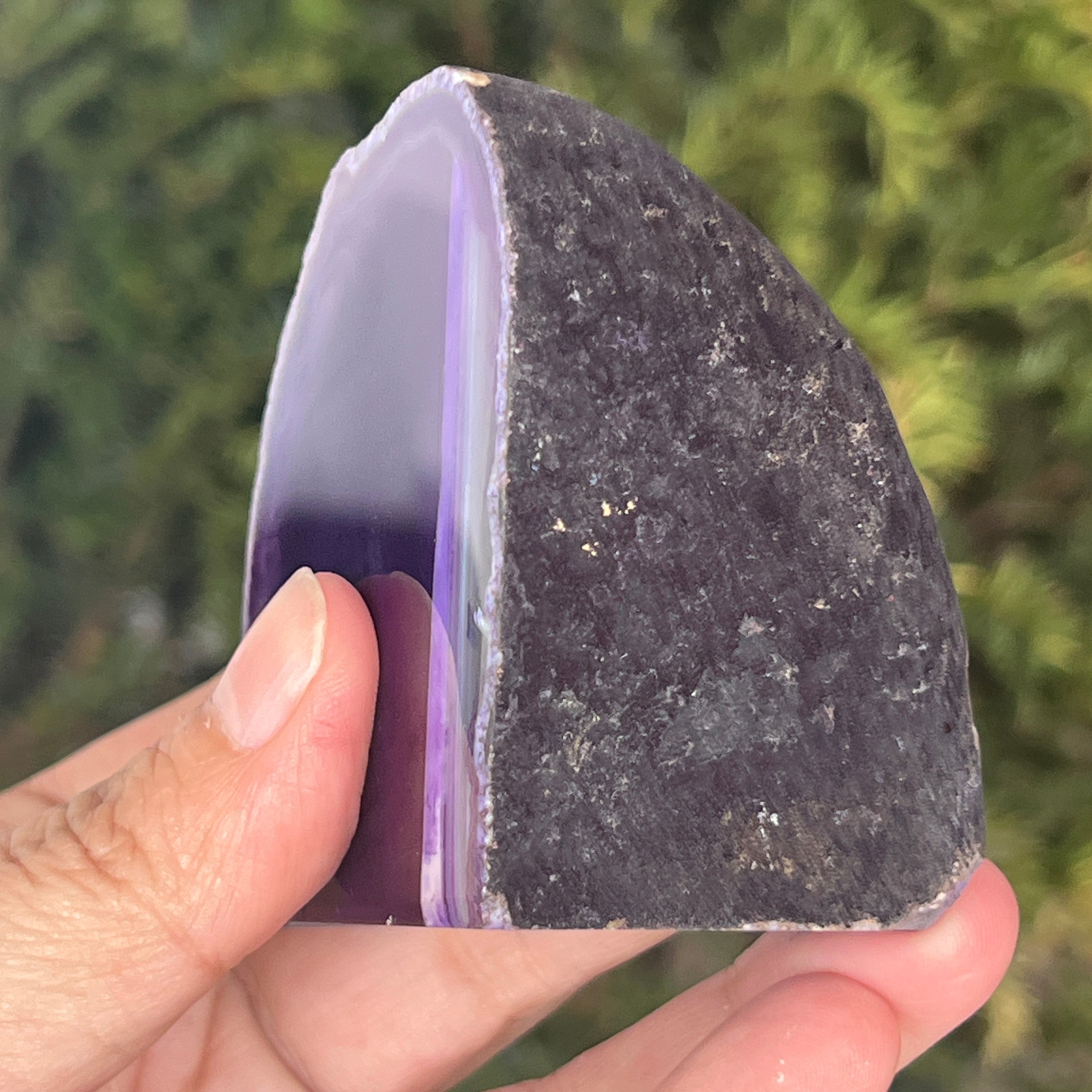 El ágata morada es una variedad de calcedonia, una forma microcristalina de cuarzo caracterizada por su estructura estratificada formada en cavidades de rocas volcánicas. El color violeta resalta las bandas delicadas del mineral y crea contrastes espectaculares. Es apreciado tanto por su estética particular como por la simbología relacionada con la calma, la intuición y la claridad mental.