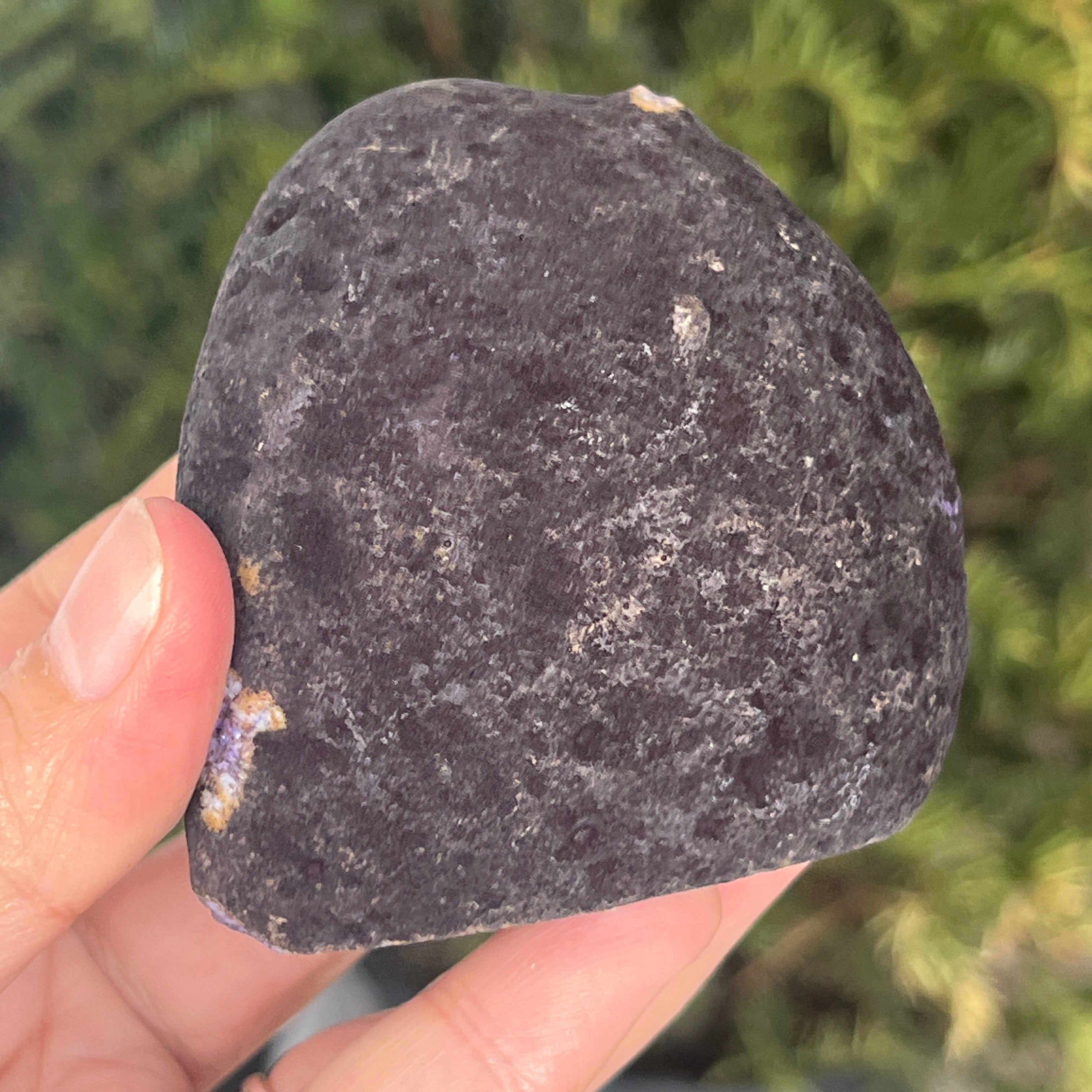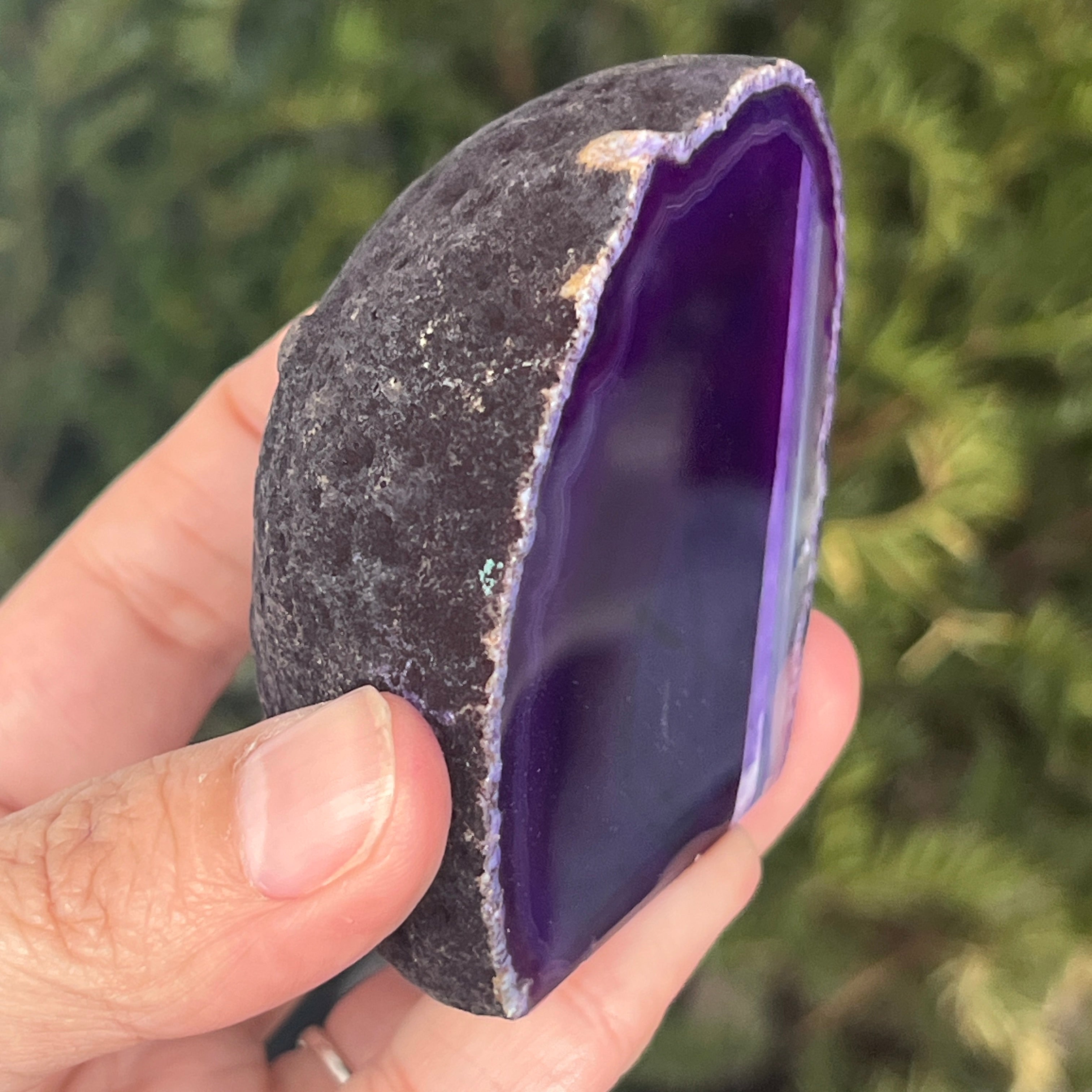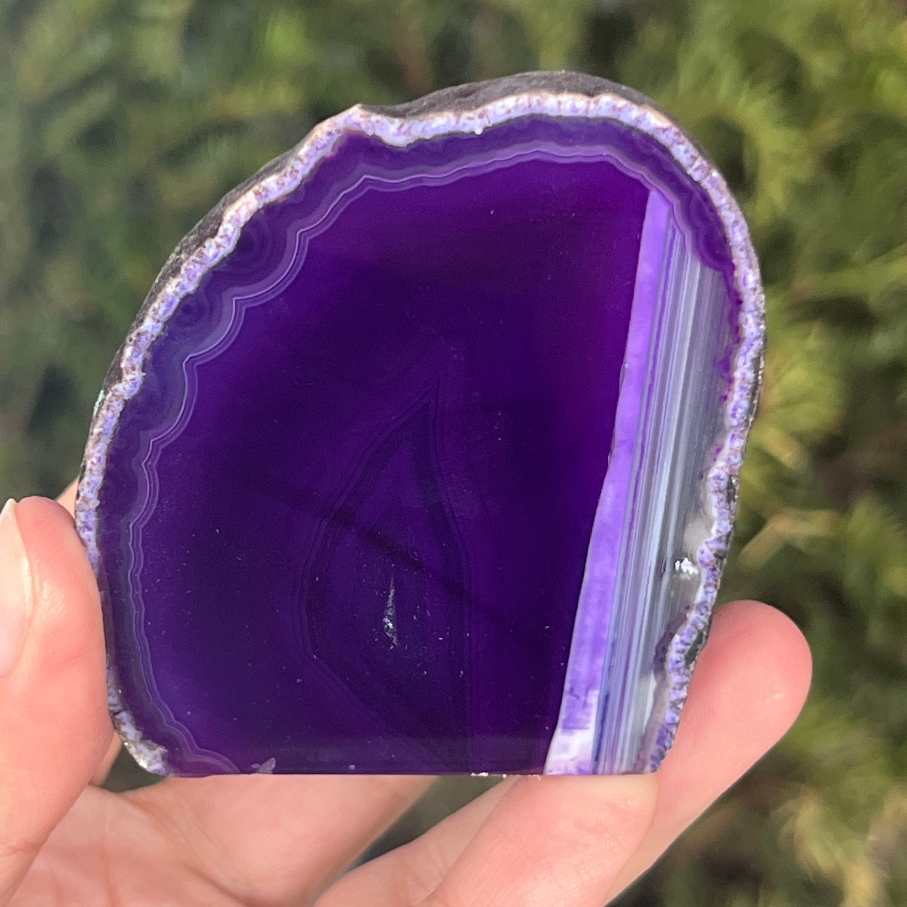 El ágata morada es una variedad de calcedonia, una forma microcristalina de cuarzo caracterizada por su estructura estratificada formada en cavidades de rocas volcánicas. El color violeta resalta las bandas delicadas del mineral y crea contrastes espectaculares. Es apreciado tanto por su estética particular como por la simbología relacionada con la calma, la intuición y la claridad mental.