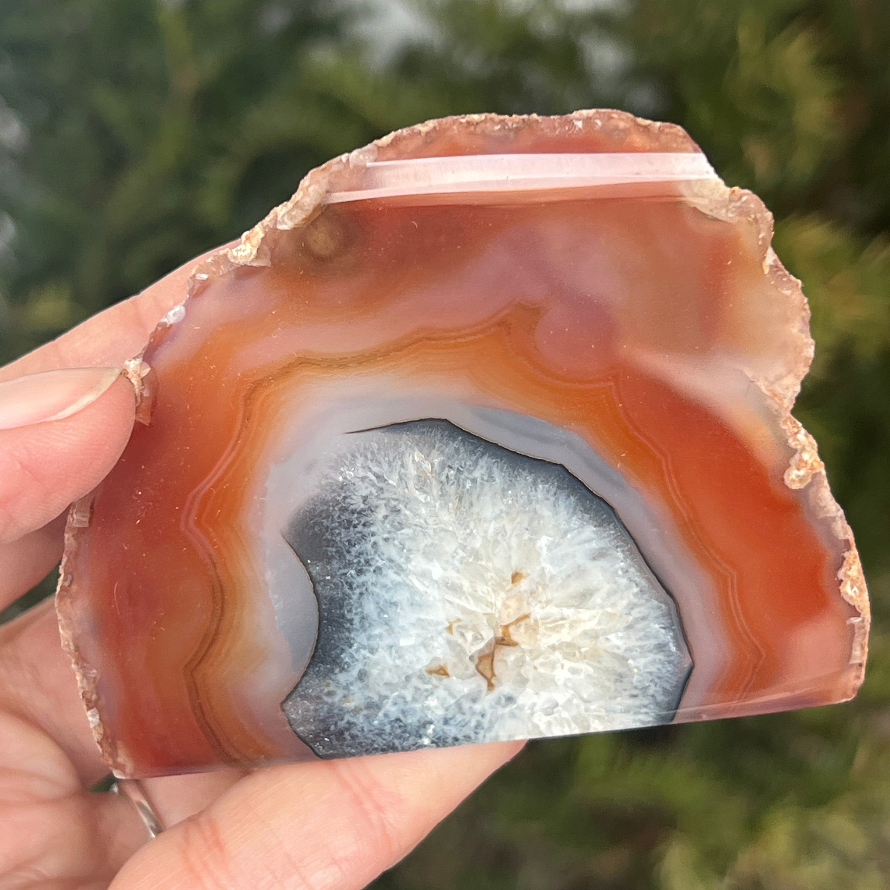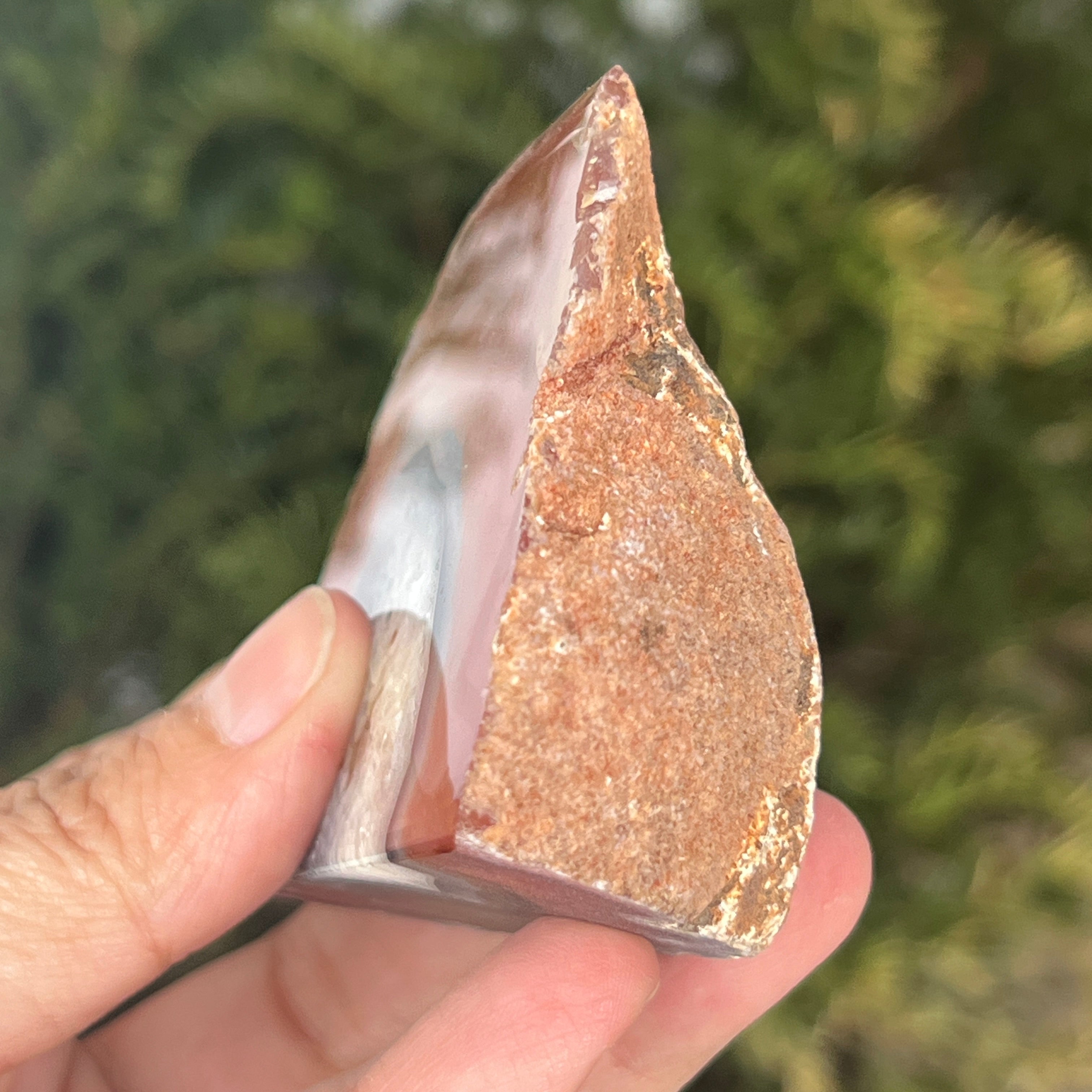 La ágata roja es una variedad de cuarzo microcristalino de la familia de las calcedonias, formada por depósitos sucesivos de sílice en cavidades volcánicas. Sus tonos cálidos suelen estar influenciados por la presencia de óxidos de hierro, que le dan su intenso color. Es una variedad de ágata apreciada tanto por la belleza natural de sus bandas como por la simbología asociada con la vitalidad, el coraje y el equilibrio emocional.