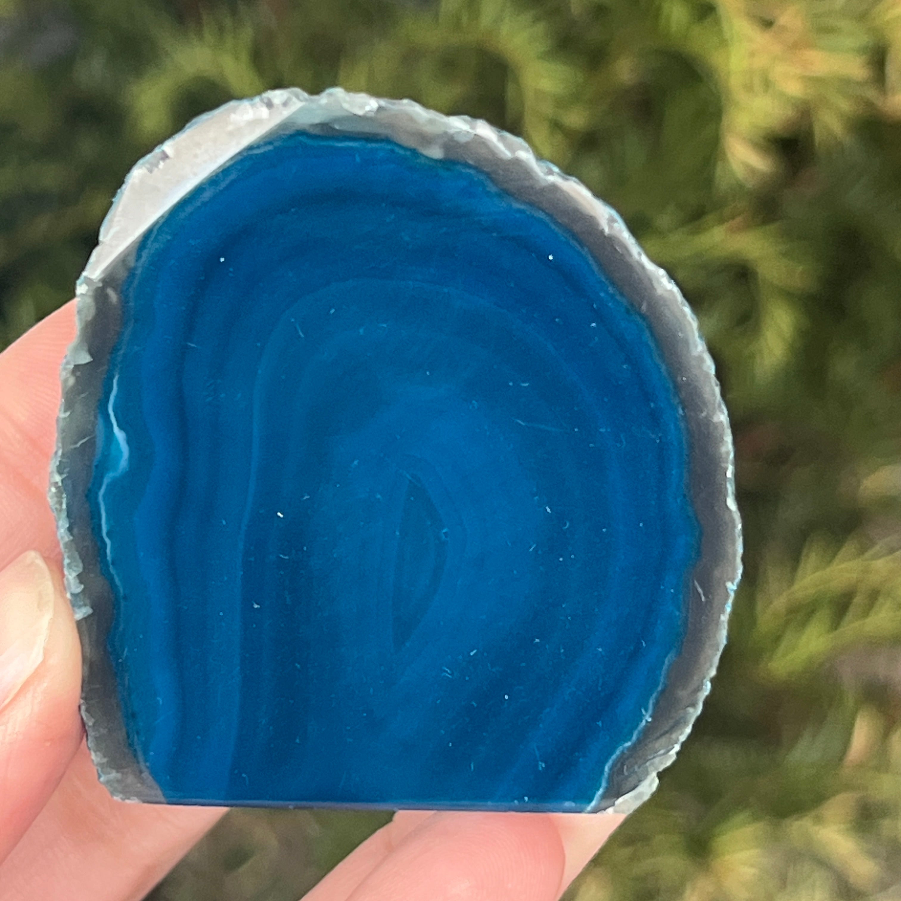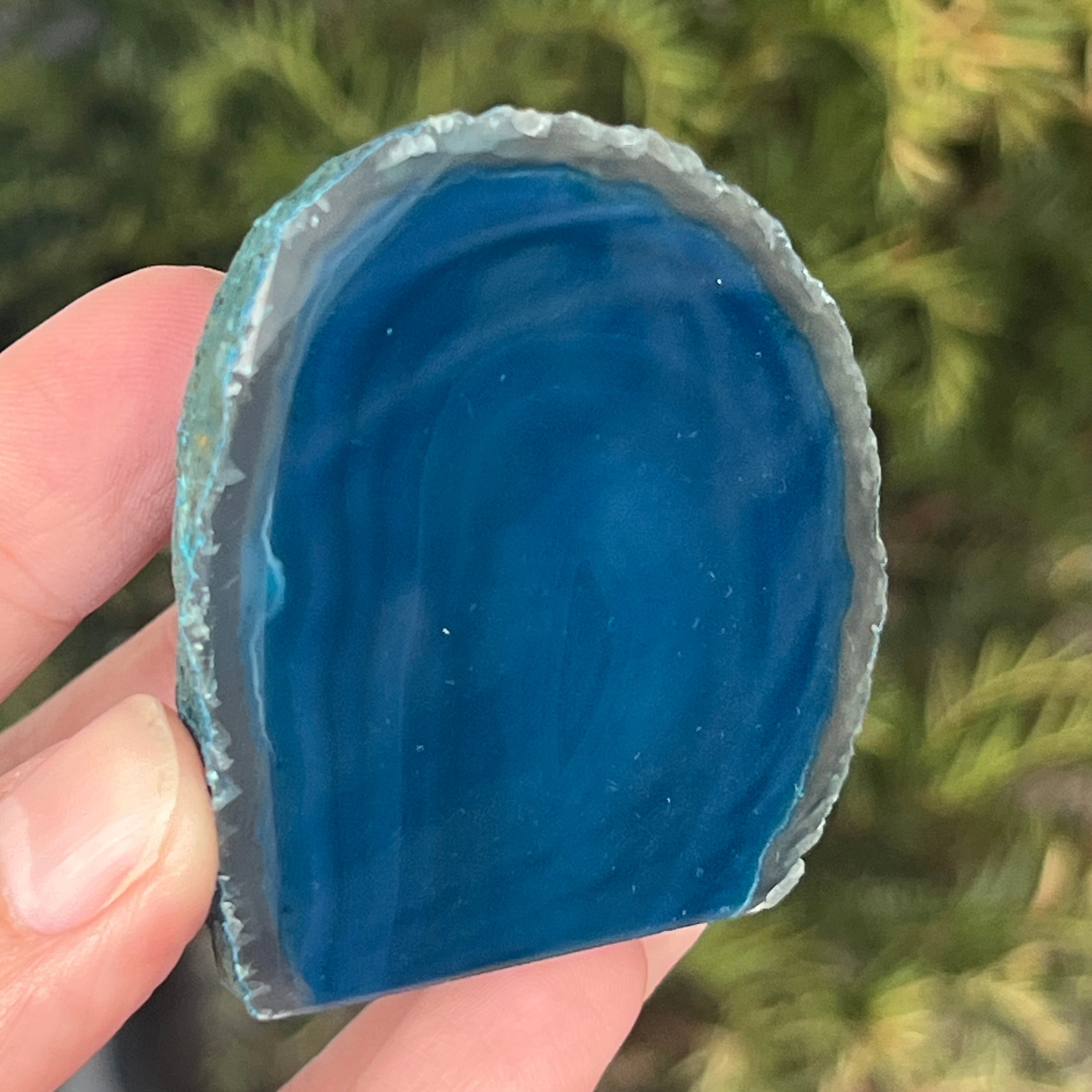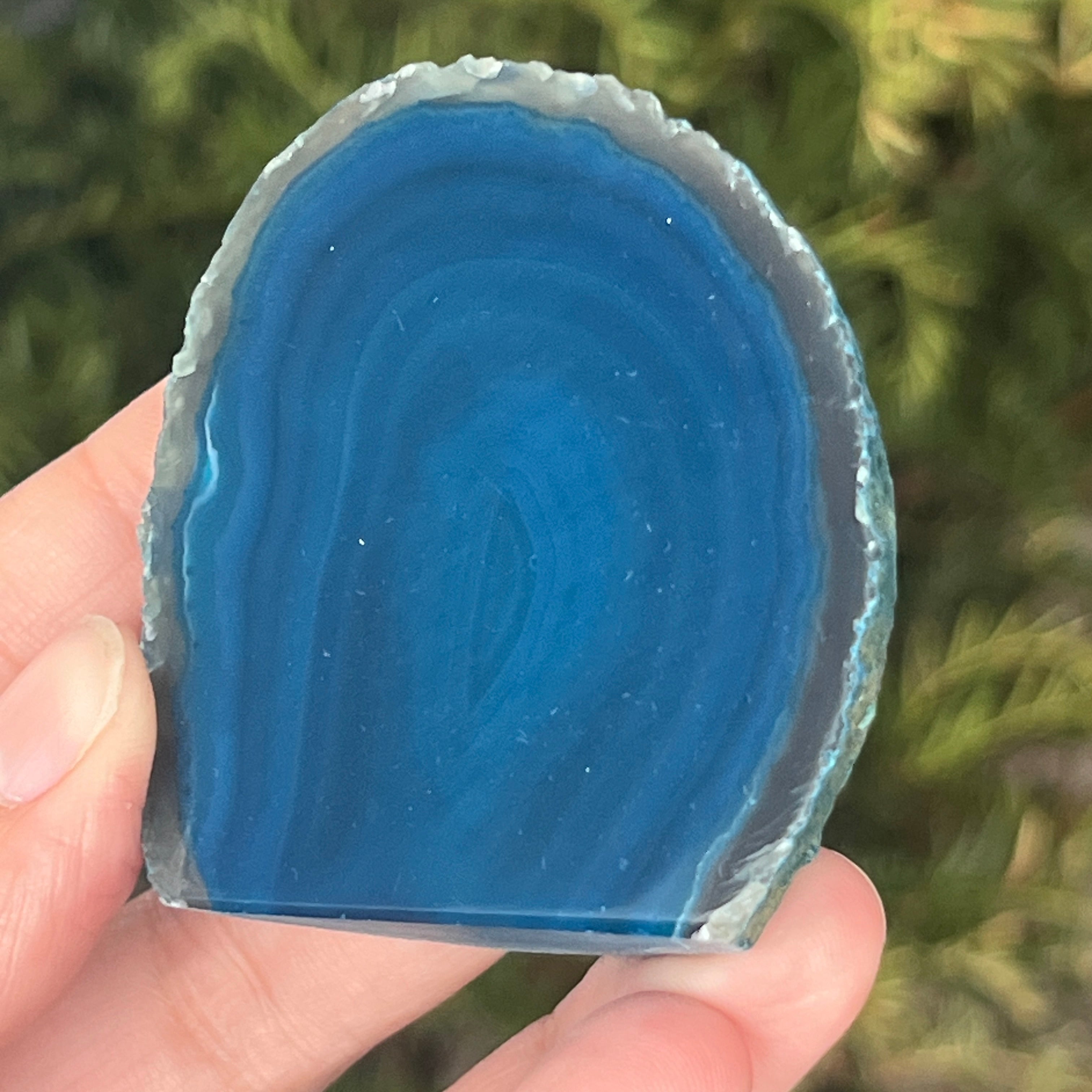 La ágata verde-azulada es una variedad de calcedonia con estructura estratificada, formada por depósitos sucesivos de sílice en cavidades geológicas. Sus tonos entre verde y azul resaltan las bandas naturales características de la ágata. Es apreciada por la armonía de sus colores y por la simbología asociada con el equilibrio interior y la tranquilidad emocional.