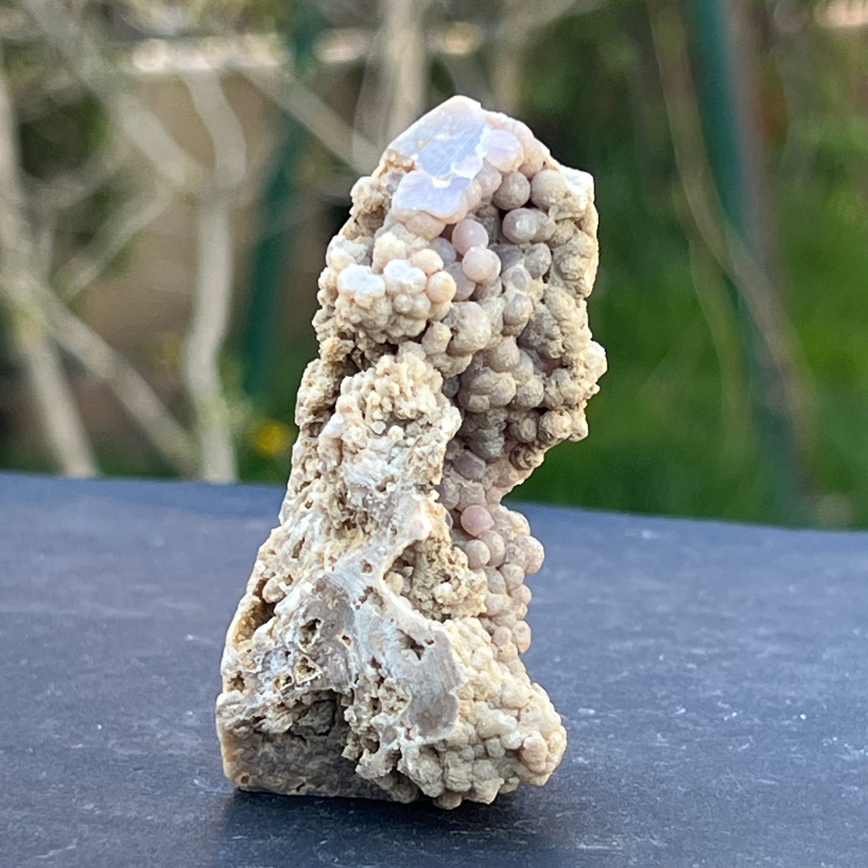 El ágata de uva se forma en las cavidades de las rocas volcánicas, donde las soluciones ricas en silicio se enfrían y cristalizan, creando el patrón distintivo de la uva.