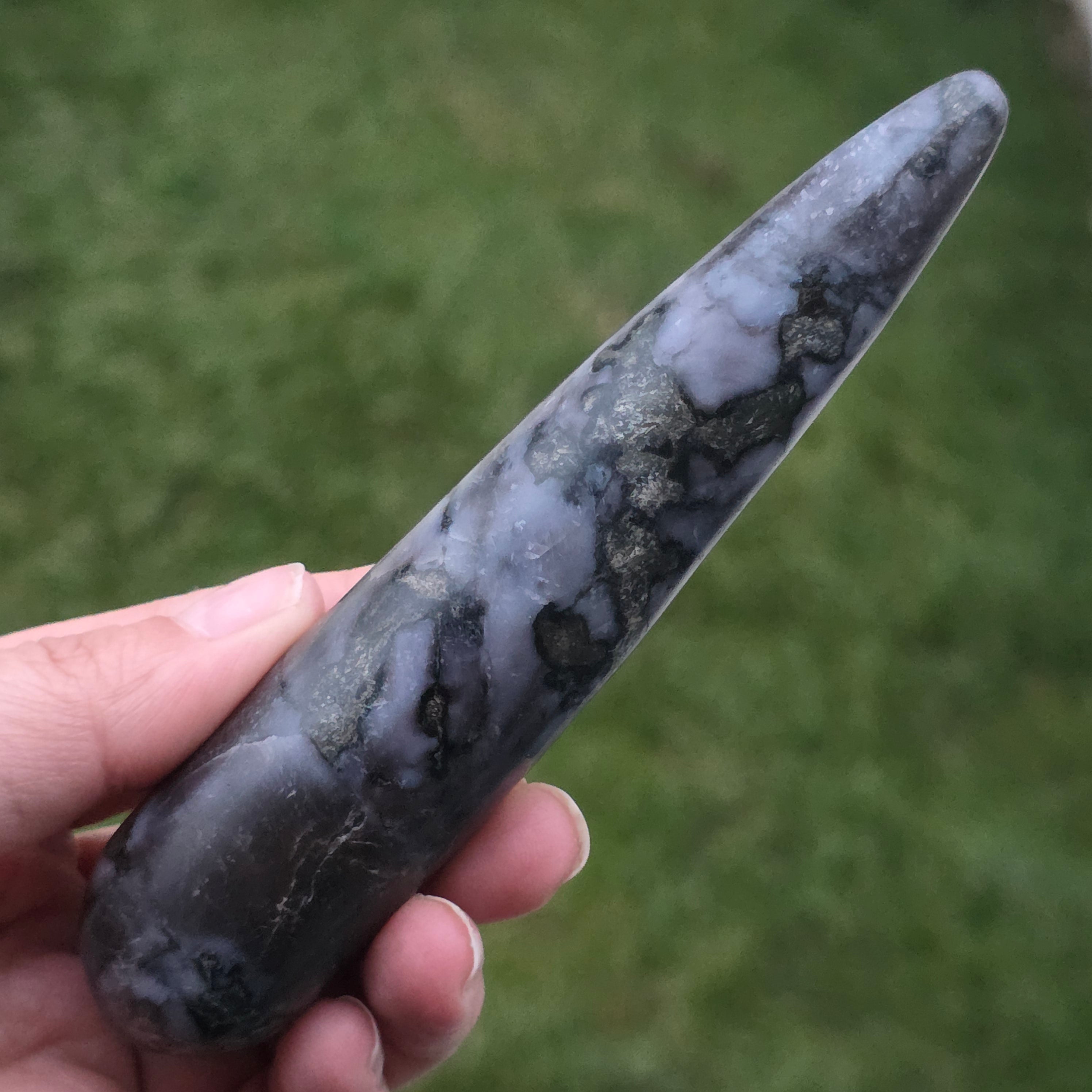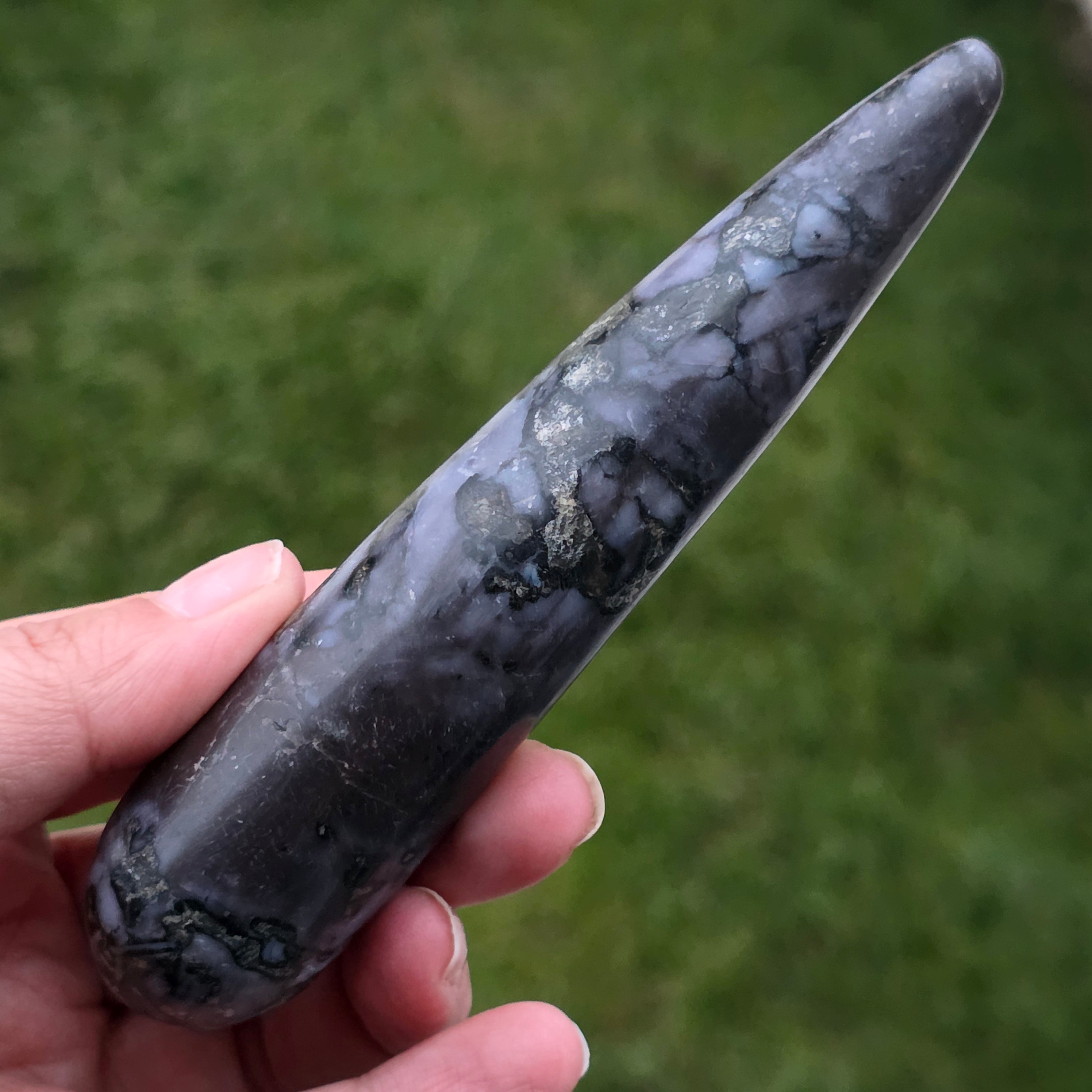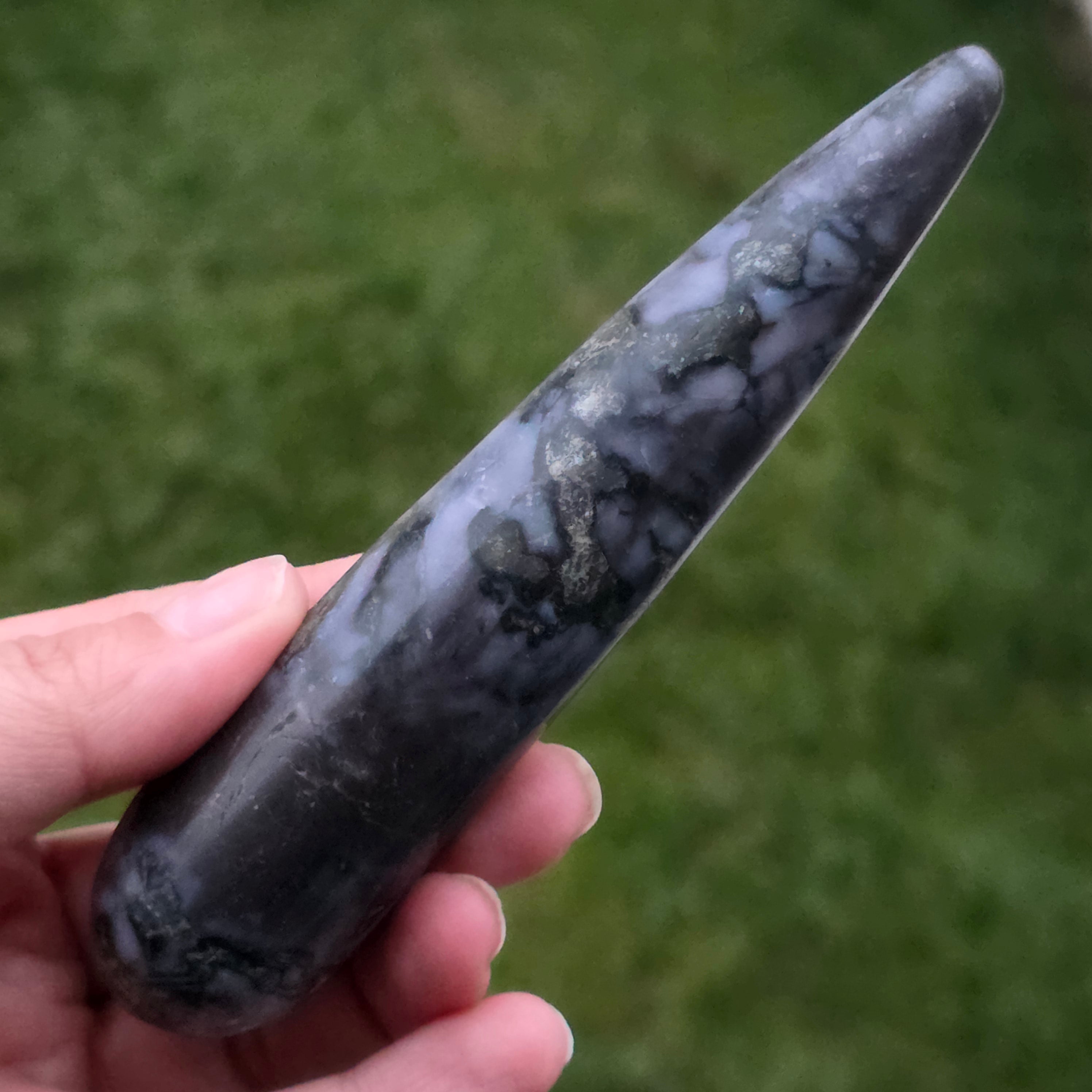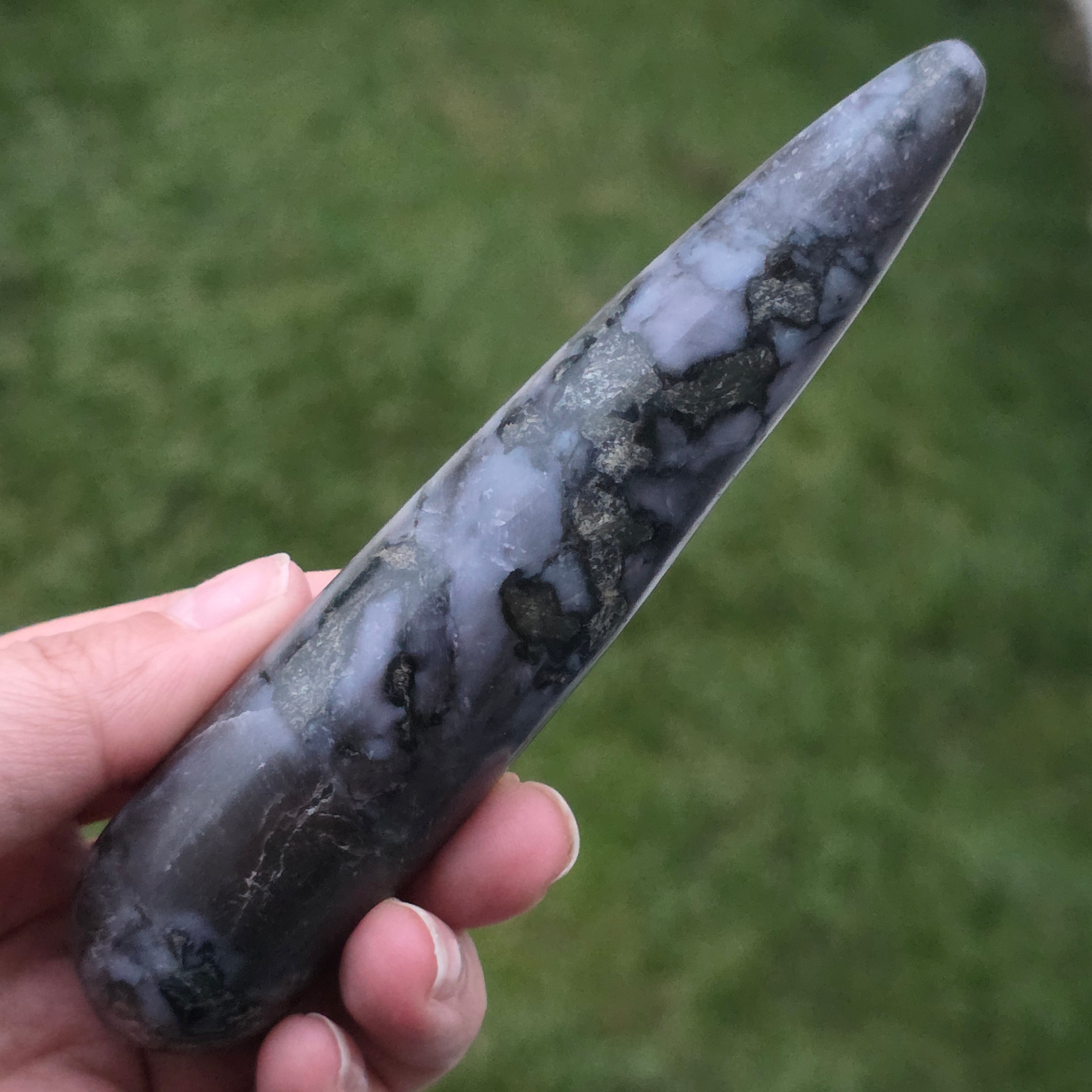 El merlín es una piedra semipreciosa rara y fascinante, reconocida por su combinación de colores contrastantes, blanco y negro, que le otorgan un aspecto único. Se considera una variedad de ópalo dendrítico o una combinación de cuarzo y otros minerales, y su estructura compleja la hace apreciada tanto por su belleza como por sus supuestas propiedades energéticas. El merlín es conocido en el mundo de la cristaloterapia por sus energías místicas y su asociación con la intuición, la clarividencia y el conocimiento espiritual.